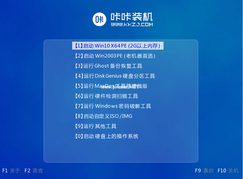 5、繼續(xù)選擇第一項(xiàng)咔咔裝機(jī)pe系統(tǒng)回車進(jìn)入。