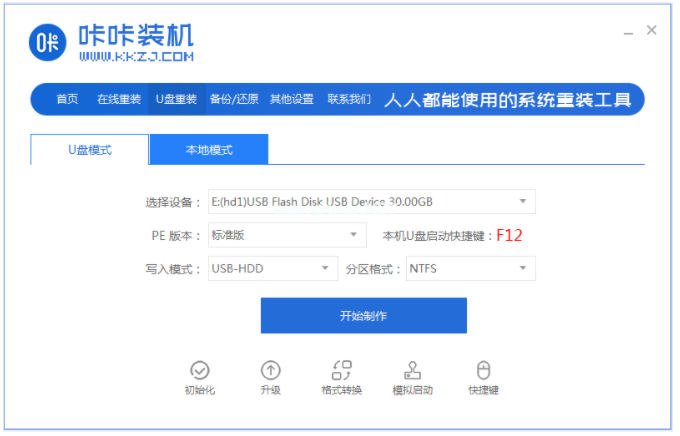 1、首先先自行在電腦上下載安裝好咔咔一鍵重裝系統(tǒng)工具打開,插入空白u(yù)盤到電腦,選擇制作系統(tǒng)模式點(diǎn)擊開始制作啟動盤。
