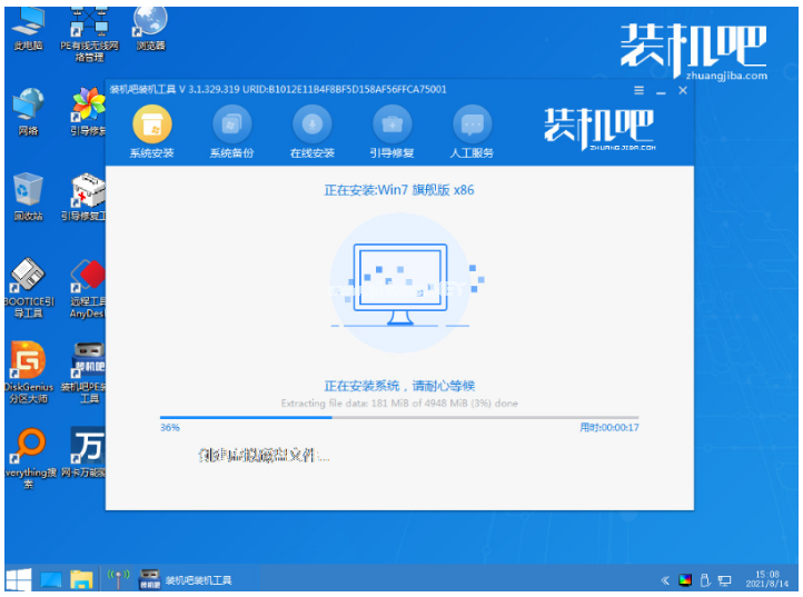 5、進(jìn)入到pe系統(tǒng)中,打開(kāi)裝機(jī)吧裝機(jī)工具,選擇需要的win7系統(tǒng),點(diǎn)擊安裝到系統(tǒng)盤(pán)c盤(pán),點(diǎn)擊開(kāi)始安裝。