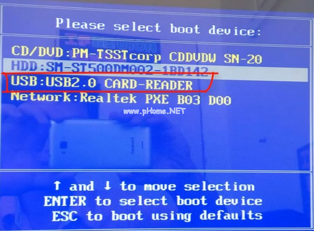6、將電腦開機快速斷續(xù)的按熱鍵進入快速啟動菜單,選擇帶usb的選項,按回車鍵進入PE選擇界面。
