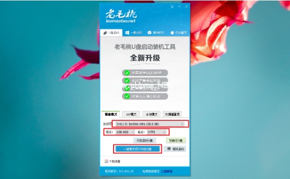 1、插入一個8g以上的空u盤到電腦接口,下載并打開老毛桃u盤啟動盤制作工具,默認設置,點擊“一鍵制作成USB啟動盤”。