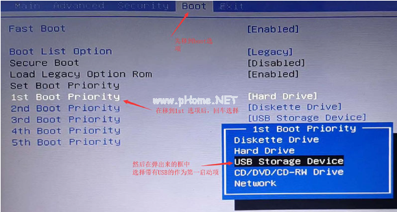 2、通過bios快捷鍵進入boot頁面,設置u盤為第一啟動,然后重啟。