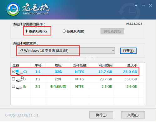 4、然后,打開老毛桃一鍵裝機軟件,選擇系統(tǒng)鏡像安裝到系統(tǒng)盤c盤,點擊執(zhí)行。