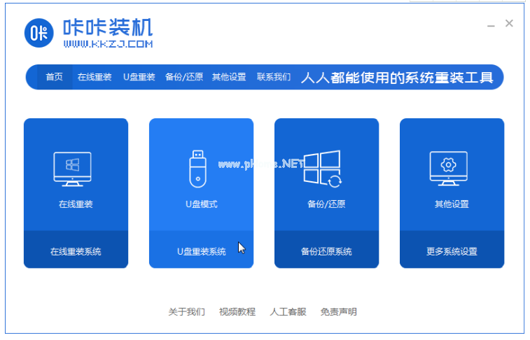 1、首先下載安裝咔咔裝機(jī)軟件到電腦上并打開,選擇U盤重裝系統(tǒng)。