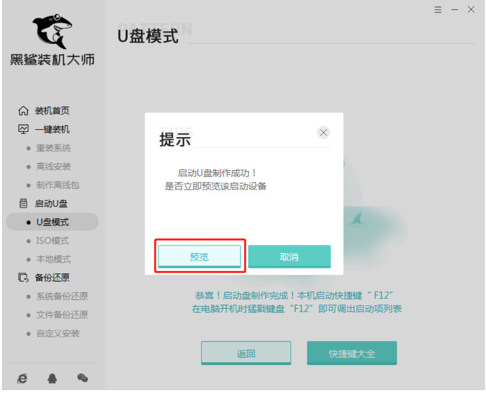 5.U盤啟動盤制作完成后,在提示窗口中點擊“預覽”進行模擬測試。
