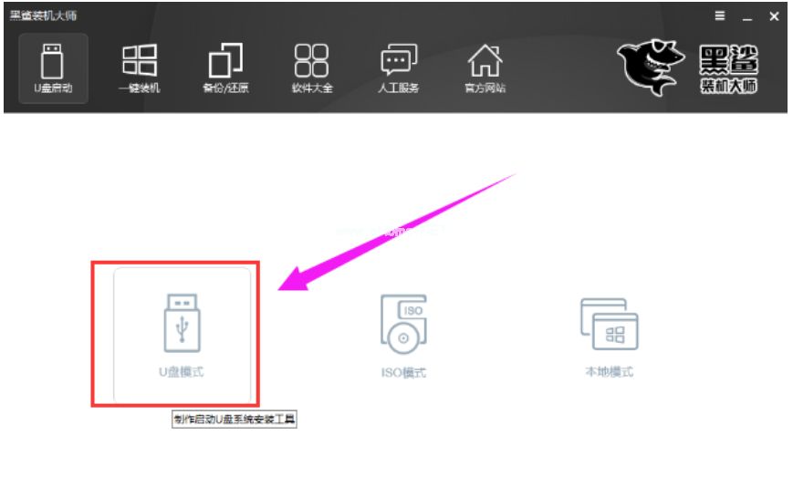 1.首先將U盤插入電腦USB接口,然后打開下載好的黑鯊裝機大師,下載的黑鯊裝機大師位本地版,可直接打開運行。在黑鯊裝機大師界面,點擊U盤啟動,打開U盤模式。