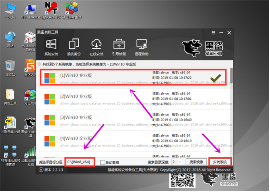5.當電腦進入PE界面之后,會自動彈出黑鯊裝機工具。如果沒有彈出,可以通過桌面快捷方式打開。打開后,選擇U盤內的系統(tǒng)安裝到分區(qū),點擊安裝系統(tǒng),即可開始系統(tǒng)安裝操作。