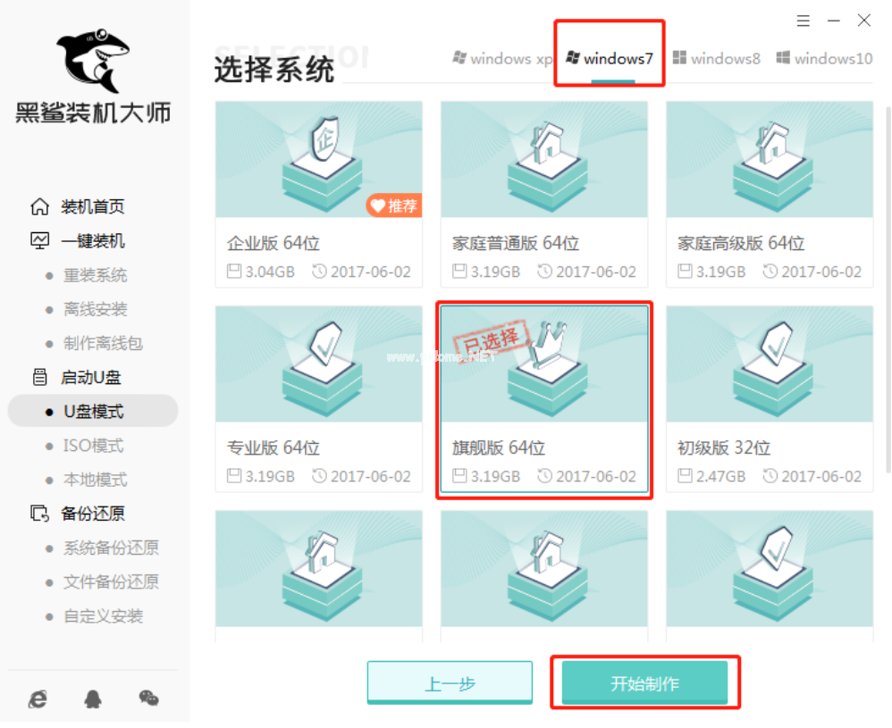 2.因為要重裝win7系統(tǒng),直接在“windows7”下選擇需要重裝的系統(tǒng)文件后點擊“開始制作”。