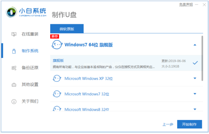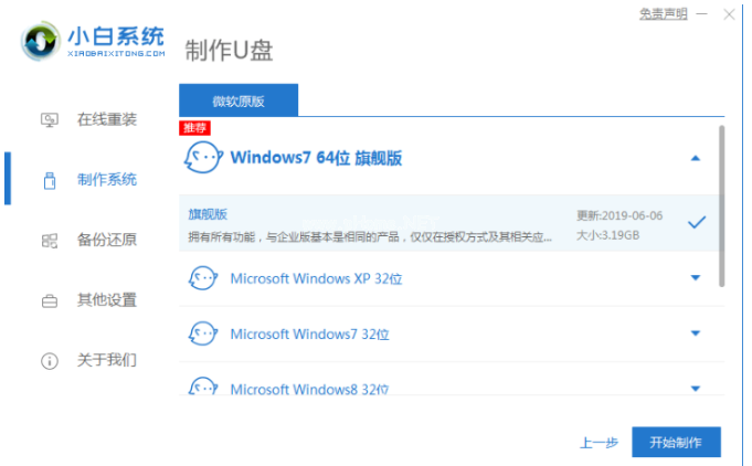 2、選擇我們需要安裝的系統(tǒng),鼠標(biāo)點(diǎn)擊開始制作啟動(dòng)盤。