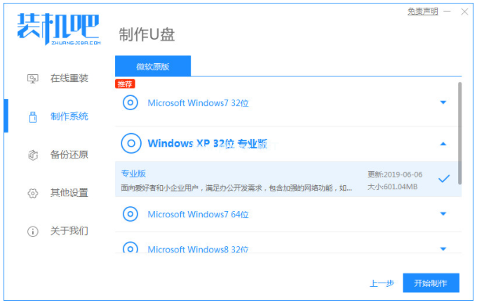 1、首先我們需要把之前準備好的U盤插入電腦上,然后雙擊打開裝機吧一鍵重裝系統(tǒng)軟件,在制作系統(tǒng)下選擇U盤,可以點擊開始制作。