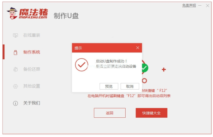 3、大家耐心等待軟件制作u盤啟動盤,然后快速預覽需要安裝的電腦主板的啟動熱鍵,再拔除u盤退出。