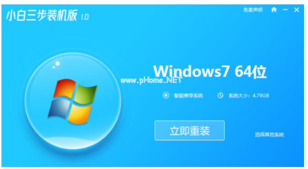1、打開小白三步裝機(jī)軟件,選擇win7系統(tǒng),點擊立即重裝。