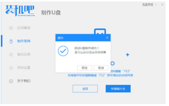 3.等待裝機(jī)軟件制作u盤啟動盤成功后,快速預(yù)覽需要安裝的電腦主板的啟動熱鍵,再拔除u盤退出。