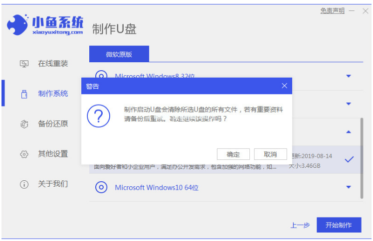 2、制作啟動盤前大家需要確定已備份好U盤內(nèi)的文件資料等等,點擊確定。