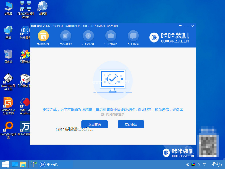 7、等待系統(tǒng)自動安裝完成之后,再拔掉u盤,點擊立即重啟電腦。