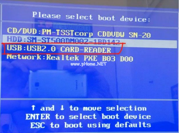6、把u盤插入需要裝系統(tǒng)電腦接口,然后開機按熱鍵進入啟動項的界面,選擇USB項,按回車鍵進入。