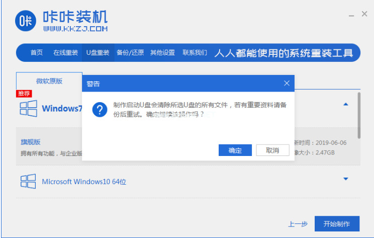 3、電腦出現(xiàn)提示框界面,確認(rèn)U盤內(nèi)文件資料全部備份好,點擊開始制作。