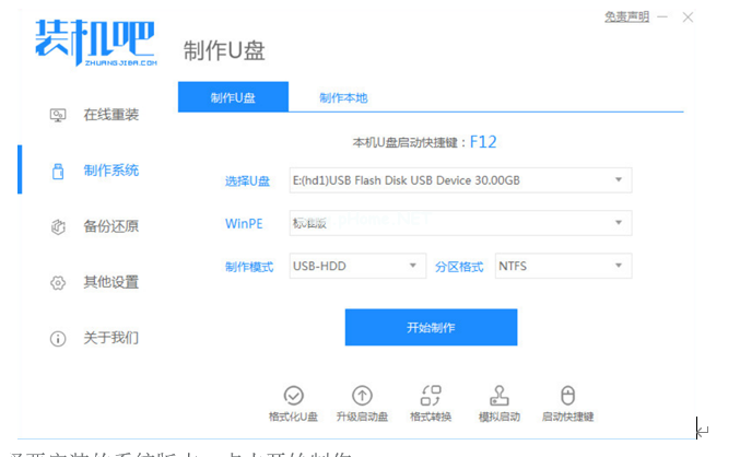 1、打開裝機吧工具軟件,插入U盤到電腦,點擊開始制作。