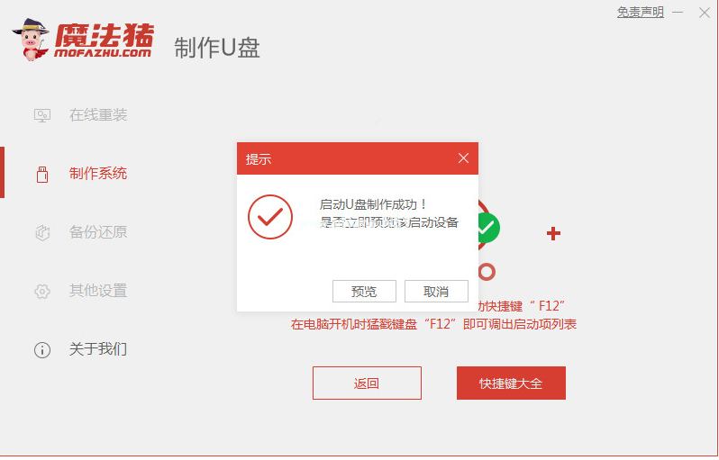 3、當(dāng)制作u盤(pán)成功后,可先預(yù)覽需要安裝的電腦主板的啟動(dòng)熱鍵,再拔除u盤(pán)退出。
