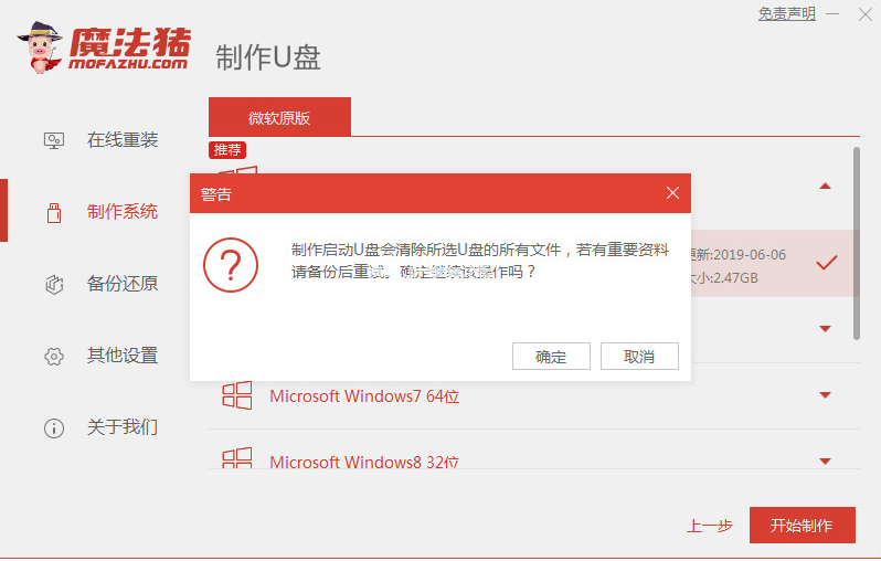 1、先在可用的電腦上下載安裝好魔法豬一鍵重裝系統(tǒng)工具并打開(kāi),插入u盤(pán),選擇u盤(pán)重裝系統(tǒng)模式,點(diǎn)擊開(kāi)始制作。