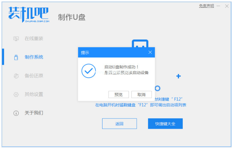 3、提示制作成功,可以先預(yù)覽電腦主板的啟動快捷鍵,拔掉u盤退出。