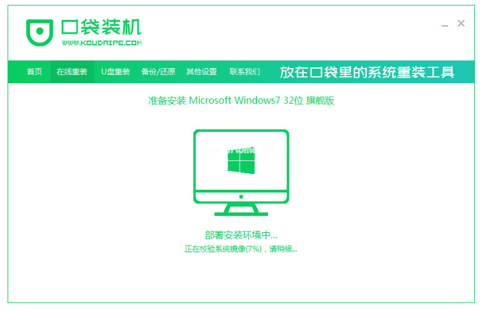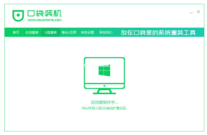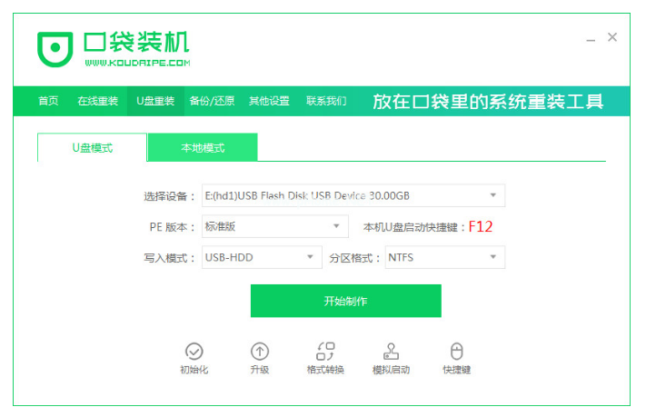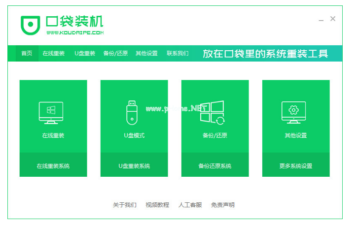 1、先下載口袋裝機(jī)工具軟件,再插入U(xiǎn)盤,點(diǎn)擊U盤重裝系統(tǒng)。