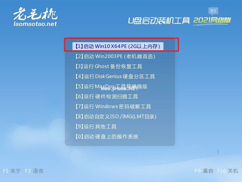 2、進入老毛桃winpe 主菜單界面后,選擇【1】Win10X64PE(2G以上內(nèi)存)并按回車。