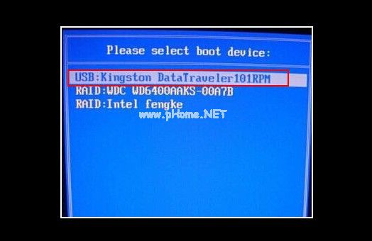 6、u盤插入需要重裝的電腦上,重啟電腦快速斷續(xù)的按啟動熱鍵進入快速啟動界面,選擇帶USB開頭的u盤啟動項回車鍵進入。