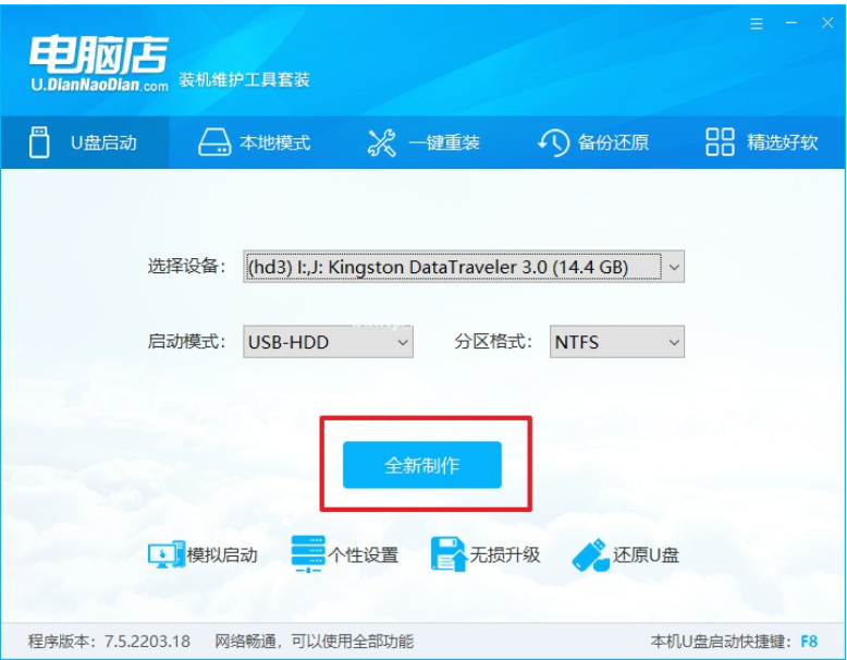 3、插入u盤,建議8G以上,不需要其他設(shè)置,默認(rèn)點(diǎn)擊【全新制作】。