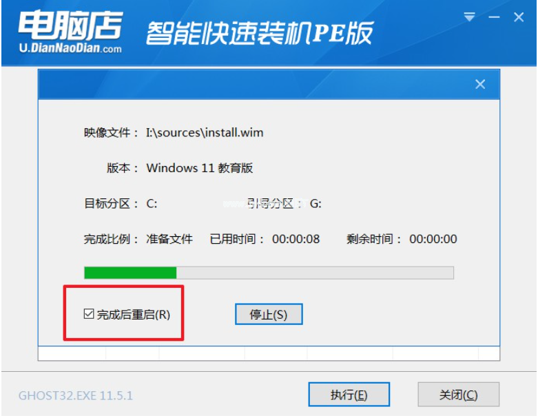 9、下面就是安裝過程了,勾選【完成后重啟】,等待安裝完成了。