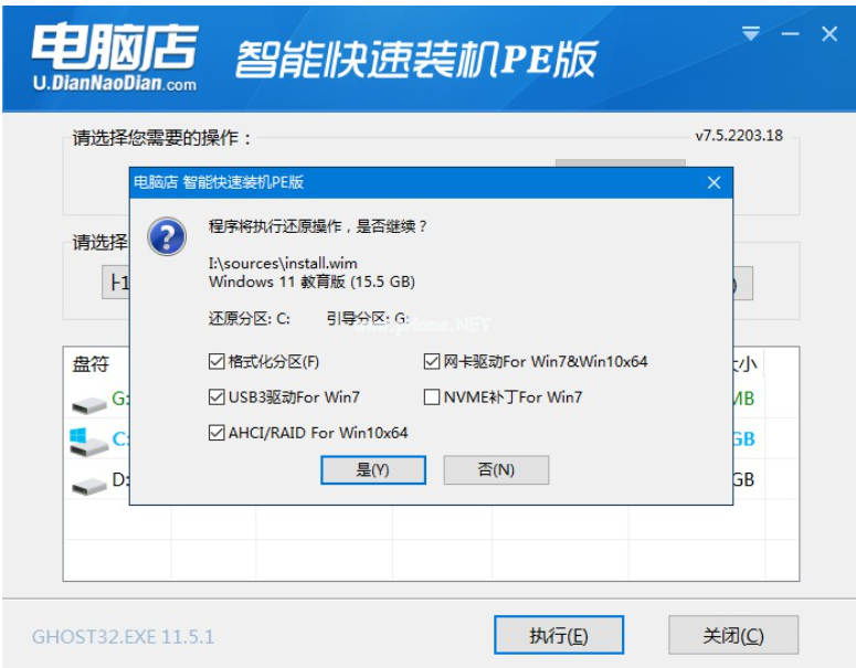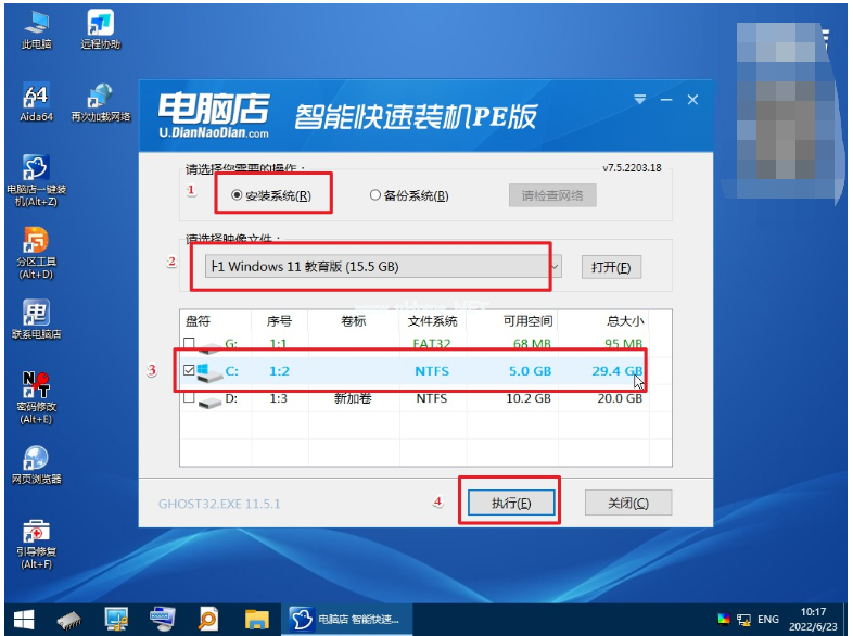 7、進(jìn)入桌面后,打開電腦店winpe一鍵裝機(jī),選中之前已下載的鏡像系統(tǒng),安裝在C盤,點(diǎn)擊【執(zhí)行】。