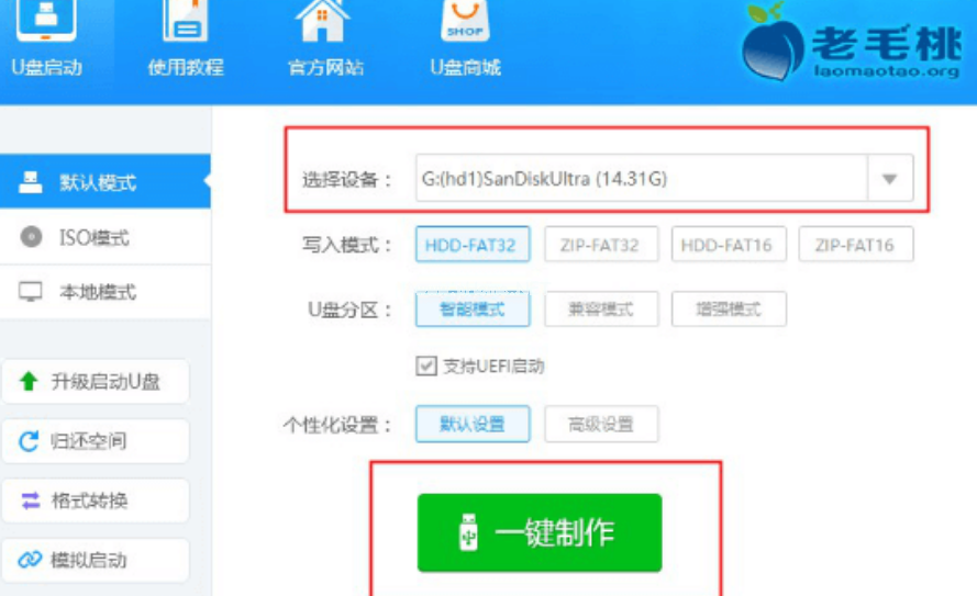 2、接著把U盤插到電腦上面,同時打開安裝好的老挑毛u盤啟動工具。自動檢測到U盤,默認(rèn)點擊 一鍵制作。