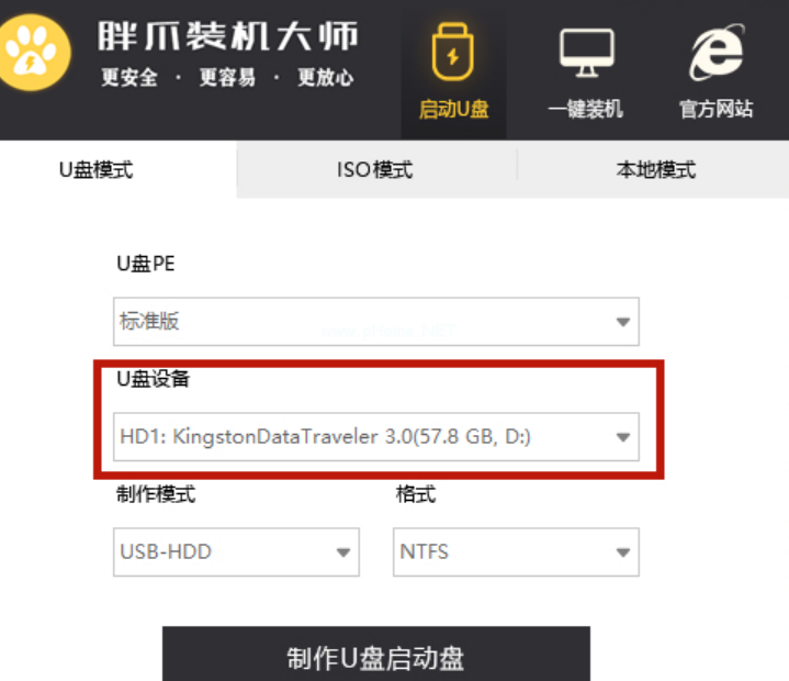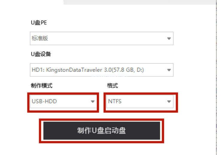 3、默認(rèn)將制作模式改為“USB-HDD”,格式改為“NTFS”后,點(diǎn)擊“制作U盤啟動(dòng)盤”;