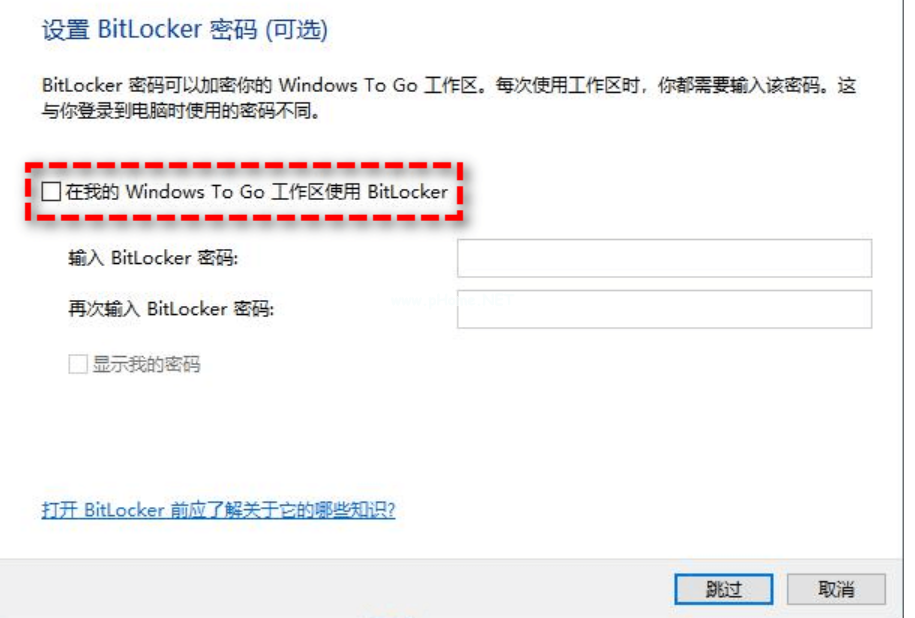4、選擇是否要在USB驅(qū)動(dòng)器中使用BitLocker加密,或者直接單擊“跳過(guò)”。