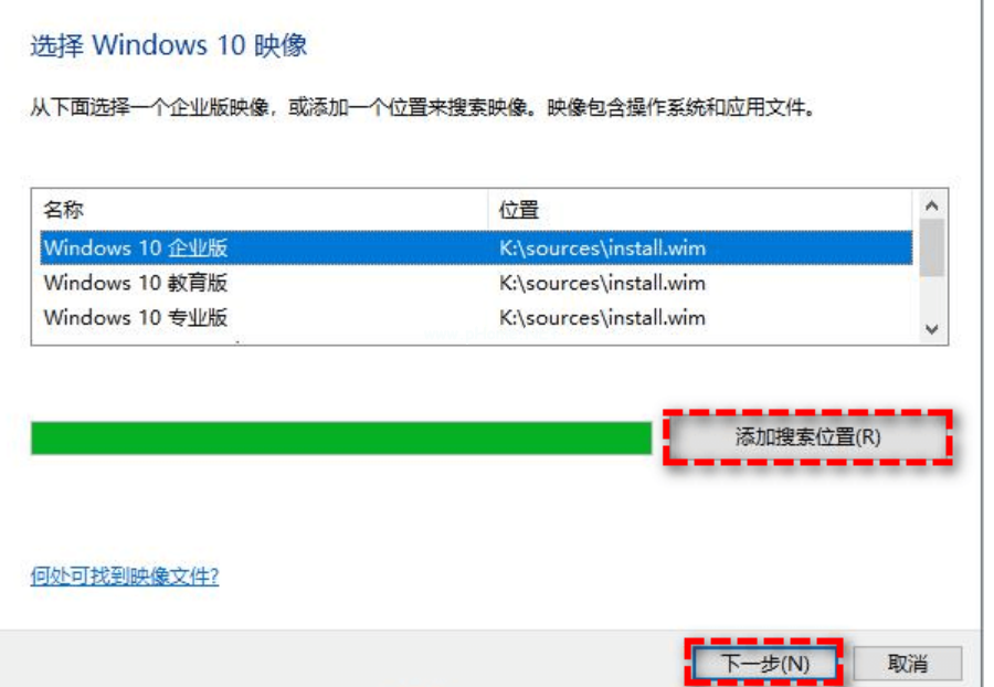 3、選擇一個(gè)您想要安裝的Windows系統(tǒng)版本,或者也可以單擊“添加搜索位置”以搜索掛載的Win10 ISO系統(tǒng)鏡像文件,然后單擊“下一步”。