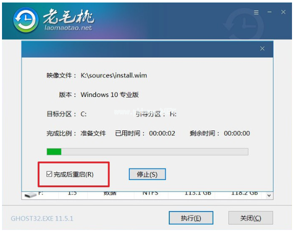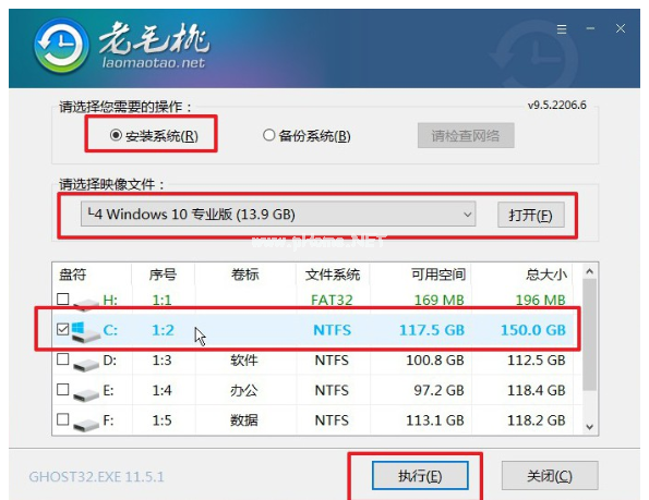 3.首先,打開老毛桃一鍵裝機(jī)軟件,找到win10系統(tǒng)鏡像,安裝在c盤,點(diǎn)擊執(zhí)行。