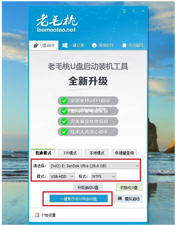 2、打開老毛桃u盤啟動盤制作工具,一鍵制作u盤啟動盤,注意制作u盤啟動盤之前,關(guān)閉電腦殺毒軟件。