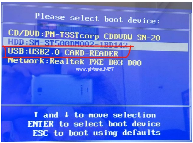 6、將電腦開機(jī)快速斷續(xù)的按熱鍵進(jìn)入快速啟動菜單,選擇帶usb的選項(xiàng),按回車鍵進(jìn)入PE選擇界面。