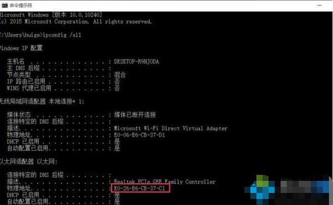 8、重新在命令窗口輸入“ipconfig /all”按回車,即可看到此時(shí)的mac地址已經(jīng)改變,變成剛剛輸入的“E0-26-B6-CB-37-C1”了。