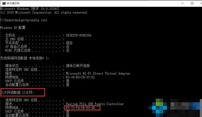 2、在命令窗口界面輸入“ipconfig /all”按回車,在顯示結(jié)果中即可看到以太網(wǎng)物理地址,也就是你的網(wǎng)卡的mac地址。