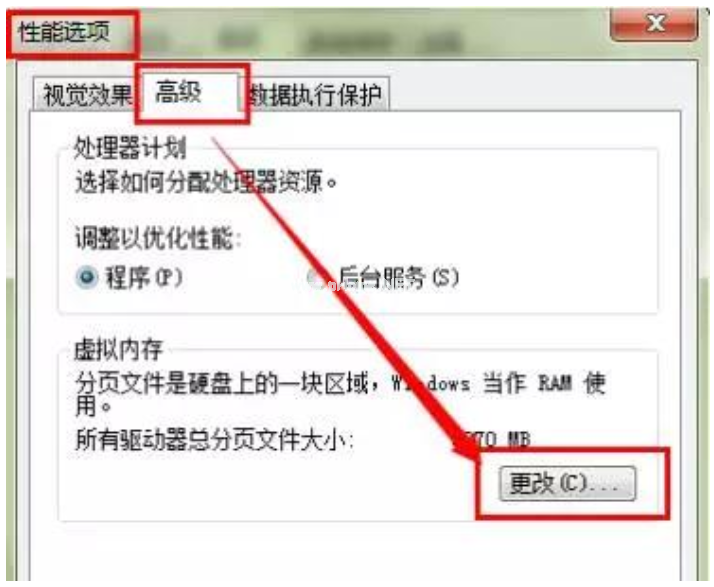 4、在性能選項(xiàng)窗口中,選擇【高級】標(biāo)簽,然后選擇【更改】。