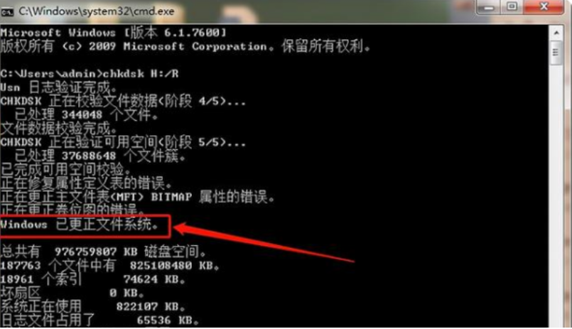 第四步:此時(shí)你如果看到“windows已更正文件系統(tǒng)”的消息,證明你的U盤被成功修復(fù)了。