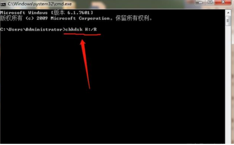 第二步:開啟大招輸入命令“chkdsk H:/R”回車執(zhí)行。