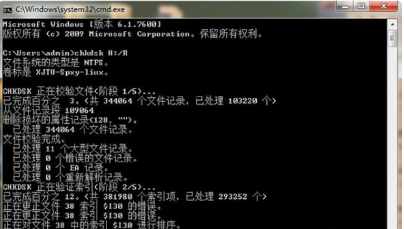 第二步:開啟大招輸入命令“chkdsk H:/R”回車執(zhí)行。(此刻就要敲黑板了,H是你的U盤盤符)
