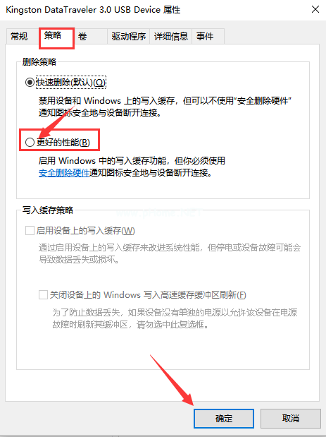 5.接著打開”策略“選項(xiàng),選擇”更好的性能“,點(diǎn)擊”確定“即可解除u盤被寫保護(hù)。