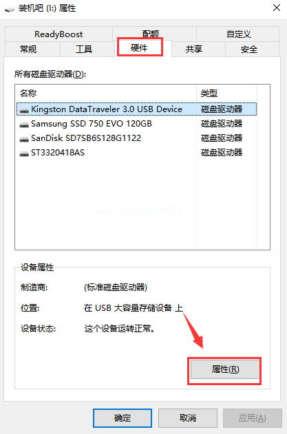 3.彈出窗口界面,在上方找到”硬件“選項(xiàng),點(diǎn)擊下方的”屬性“按鈕。