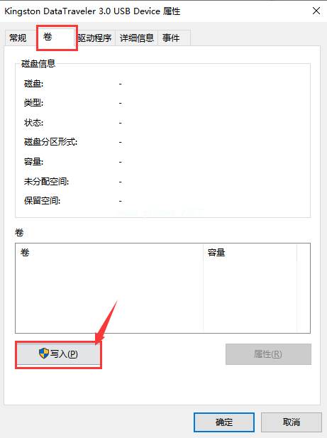 4.進(jìn)入到屬性的界面,找到”卷“選項(xiàng),點(diǎn)擊下方的”寫入“按鈕即可。