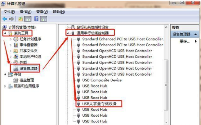1、u盤檢測不到怎么辦呢?我們首先打開桌面上的【計算機】,接著鼠標右擊選擇【管理】,在管理窗口界面中,選擇【系統工具】中的【設備管理】,最后在右邊頁面點擊【通用串行總線控制器】,找到【USB大容量存儲設備】并鼠標雙擊打開。