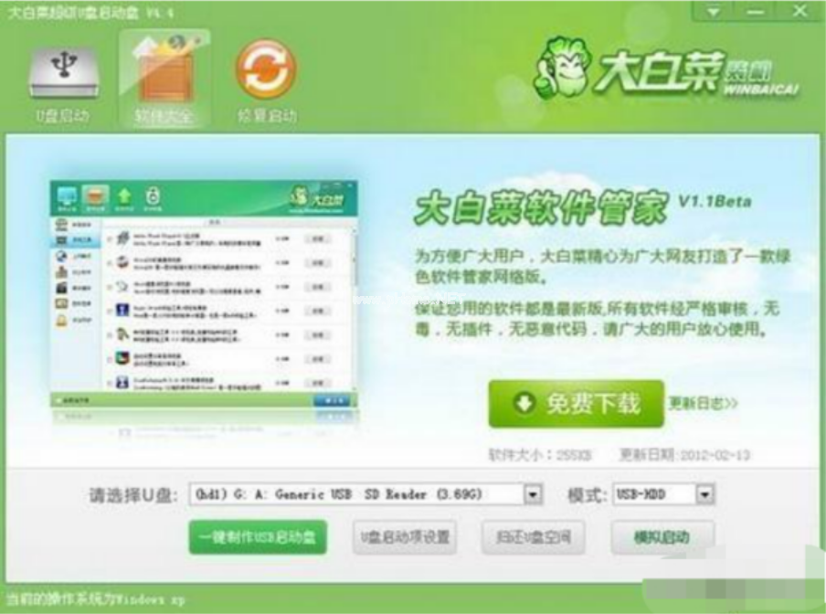 大白菜 U 盤裝機工具的制作和老毛桃類似,無大的出入!特點是:大白菜超級 U 盤啟動盤制作工具的“軟件大全”模塊提供了“大白菜軟件管家”的下載服務,其是大白菜為廣大網(wǎng)友精心挑選的綠色軟件集合,一次性整體下載后可實現(xiàn)軟件安裝一步到位。這一點是非常貼心的!并且這個功能是可以選擇的不像某些工具悄悄安裝。